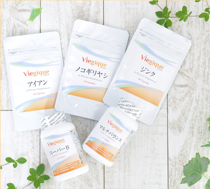 マルチバランス、スーパーB、アイアン(鉄分)、ジンク(亜鉛)、ノコギリヤシ、ビタミンD、水素&カルシウム、乳酸菌。体に必要な栄養素をサプリで補えます。
